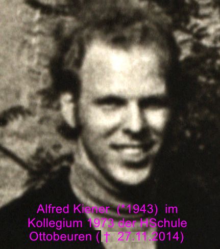 Alfred Kiener (*12.06.1943, Abitur 1963, † 27.11.2014) war Lehrer an der Hauptschule Ottobeuren und gehörte 1984 zu den Initiatoren der Ottobeurer Musikschule, die er auch später, als Leiter der Volkshochschule Ottobeuren, tatkäftig unterstützte.